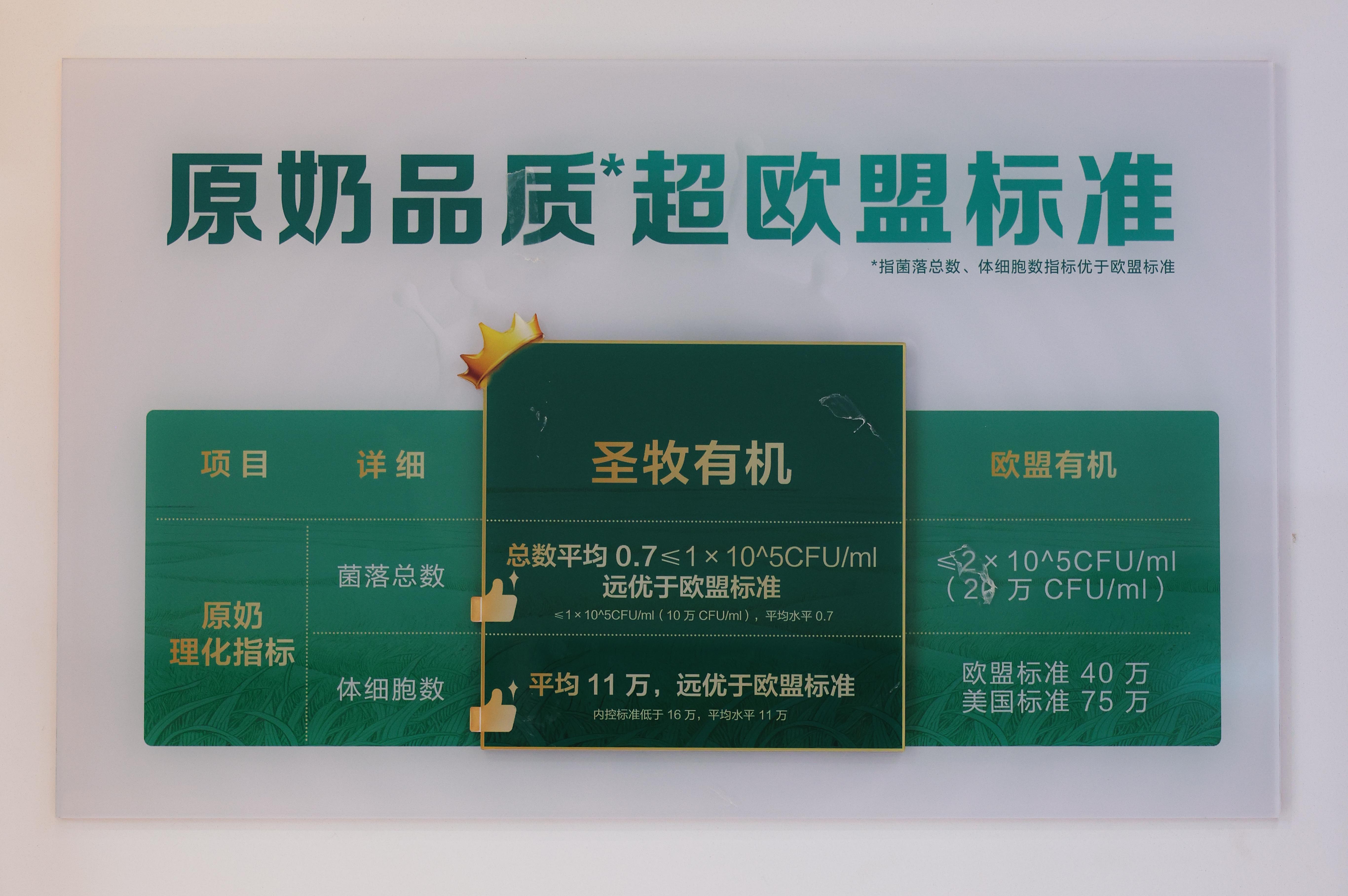 圣牧深耕有机16年,有自己的有机牧场和完整的产业链,从牧草种植、奶牛饲喂,到原奶检测、产品出厂,都有严格的标准在执行。公开数据显示,圣牧有机纯牛奶的原奶蛋白质、钙等指标均高于欧盟有机要求,相关检测报告在圣牧有机生活馆里都能看得到。